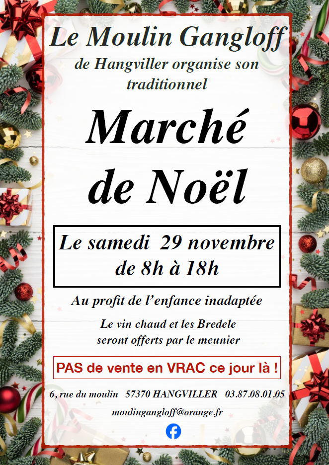 * 29 nov. – Marché de Noël du Moulin GANGLOFF – HANGWILLERMarché de Noël, Vente solidaire Notre association sera représentée.Ce sera l’occasion de découvrir notre calendrier solidaire, nos livres de recettes et les créations de nos bénévoles.